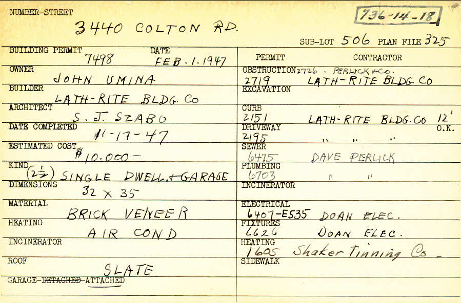 3440 Colton Road Shaker Heights, OH 44122 PARCEL ID: 736-14-018 Building Permit Date: 02-01-1947 Plan File Number: 325 scanned, 4941 Microfilm Roll: Roll004, Roll#68 Neighborhood: Mercer Owner: Umina, John Builder: Lath-Rite Building Company Architect: Szabo, S. J. Estimated Cost: 10000 Date Completed: 11-17-1947 Kind: Single Dwelling and Garage Material: Brick Veneer Heating: Air Conditioned Roof: Slate Garage: attached |