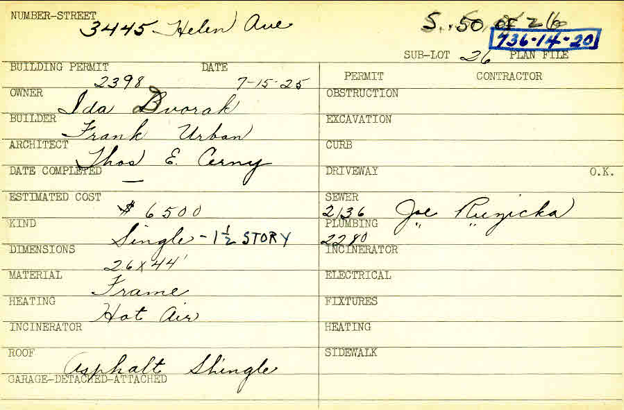 3445 Helen Road Shaker Heights, OH 44122 PARCEL ID: 736-14-020 Building Permit Date: 07-15-1925 Plan File Number: 12413 Microfilm Roll: NewRoll#13 Neighborhood: Mercer Owner: Dvorak, Ida Builder: Urban, Frank Architect: Thomas and Cerny Estimated Cost: 6500 Kind: Single, Single Residence or Dwelling Material: Frame Heating: Hot Air Roof: Asphalt Shingles |