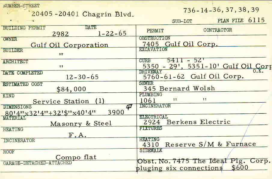 20405 Chagrin Boulevard Shaker Heights, OH 44122 PARCEL ID: 736-14-038 Building Permit Date: 01-22-1965 Plan File Number: 6115 Neighborhood: Mercer Owner: Gulf Oil Corporation Builder: Gulf Oil Corporation Architect: Gulf Oil Corporation Estimated Cost: 84000 Date Completed: 12-30-1965 Kind: Commercial - Retail or Office Material: Masonry and Steel Heating: Forced Air |
