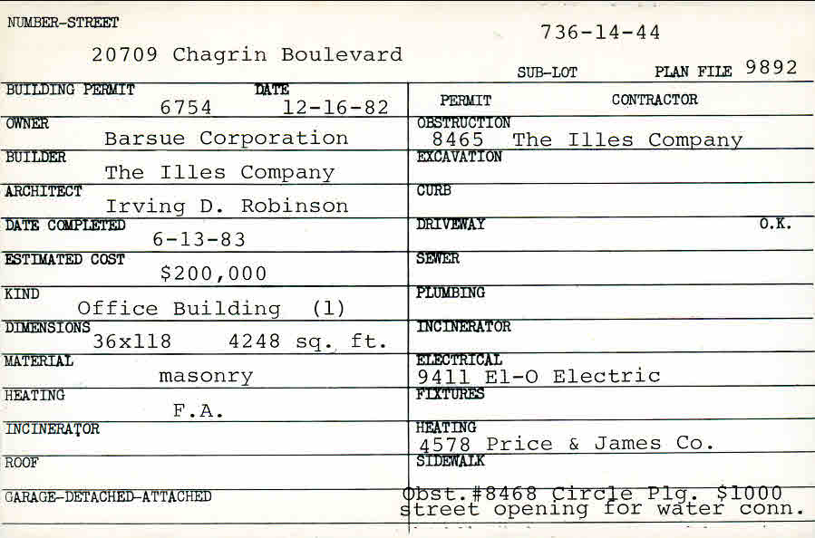 20707 Chagrin Boulevard Shaker Heights, OH 44122 PARCEL ID: 736-14-044 Building Permit Date: 12-16-1982 Plan File Number: 9892, 92-128 Microfilm Roll: NewRoll#1 Neighborhood: Mercer Owner: Barsue Corporation Builder: The Illes Company Architect: Robinson, Irving D. Estimated Cost: 200000 Date Completed: 06-13-1983 Kind: Commercial - Retail or Office Material: Masonry Heating: Forced Air |
