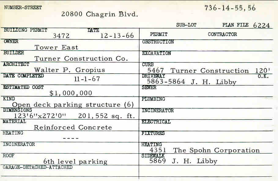 20800 Chagrin Boulevard Shaker Heights, OH 44122 PARCEL ID: 736-14-055 Building Permit Date: 12-13-1966 Plan File Number: 6224 Neighborhood: Mercer Owner: Tower East Builder: Turner Construction Company Architect: Gropius, Walter P. Estimated Cost: 1000000 Date Completed: 11-01-1967 Material: Reinforced Concrete |