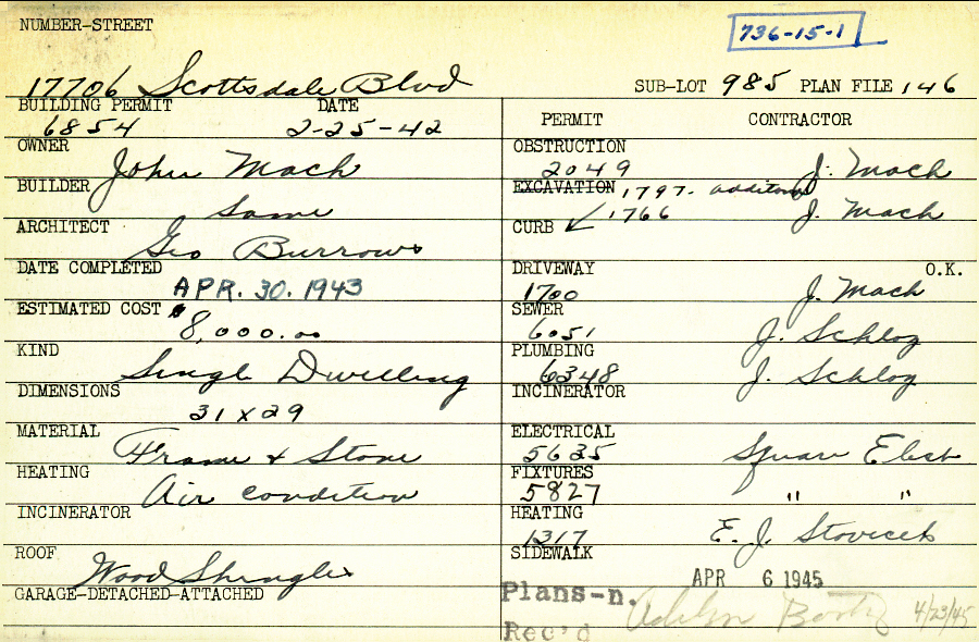 17706 Scottsdale Boulevard Shaker Heights, OH 44120 PARCEL ID: 736-15-001 Building Permit Date: 02-25-1942 Plan File Number: 146 Neighborhood: Lomond Owner: Mach, John Builder: Mach, John Architect: Burrows, George Estimated Cost: 8000 Date Completed: 04-30-1943 Kind: Single, Single Residence or Dwelling Material: Frame and Stone Heating: Air Conditioned Roof: Wood Shingle Card Available: yes |