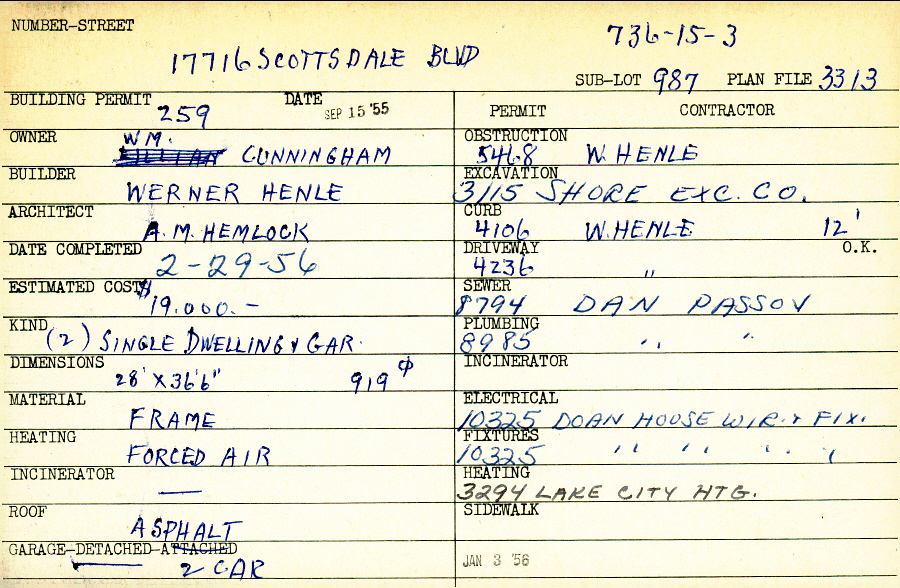 17716 Scottsdale Boulevard Shaker Heights, OH 44120 PARCEL ID: 736-15-003 Building Permit Date: 09-15-1955 Plan File Number: 3313 Microfilm Roll: Roll#48 Neighborhood: Lomond Owner: Cunningham, William Builder: Henle, Werner Architect: Hemlock, A. M. Estimated Cost: 19000 Date Completed: 02-29-1956 Kind: Single Dwelling and Garage (2) Material: Frame Heating: Forced Air Roof: Asphalt Garage: detached 2 car |