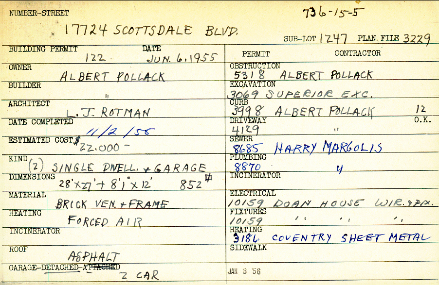 17724 Scottsdale Boulevard Shaker Heights, OH 44120 PARCEL ID: 736-15-005 Building Permit Date: 06-06-1955 Plan File Number: 3229 Microfilm Roll: Roll#47 Neighborhood: Lomond Owner: Pollack, Albert Builder: Pollack, Albert Architect: Rotman, L. J. Estimated Cost: 22000 Date Completed: 11-02-1955 Kind: Single Dwelling and Garage (2) Material: Brick Veneer and Frame Heating: Forced Air Roof: Asphalt Garage: detached 2 car |