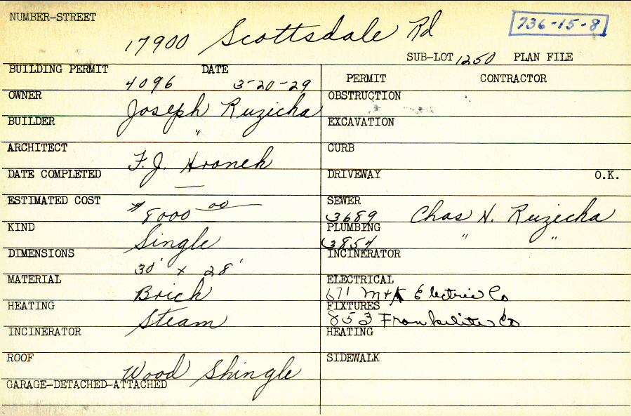 17900 Scottsdale Boulevard Shaker Heights, OH 44120 PARCEL ID: 736-15-008 Building Permit Date: 03-20-1929 Plan File Number: 0 Neighborhood: Lomond Owner: Ruzicka, Joseph Builder: Ruzicka, Joseph Architect: Hronek, F. J. Estimated Cost: 8000 Kind: Single, Single Residence or Dwelling Material: Brick Heating: Steam Roof: Wood Shingle |