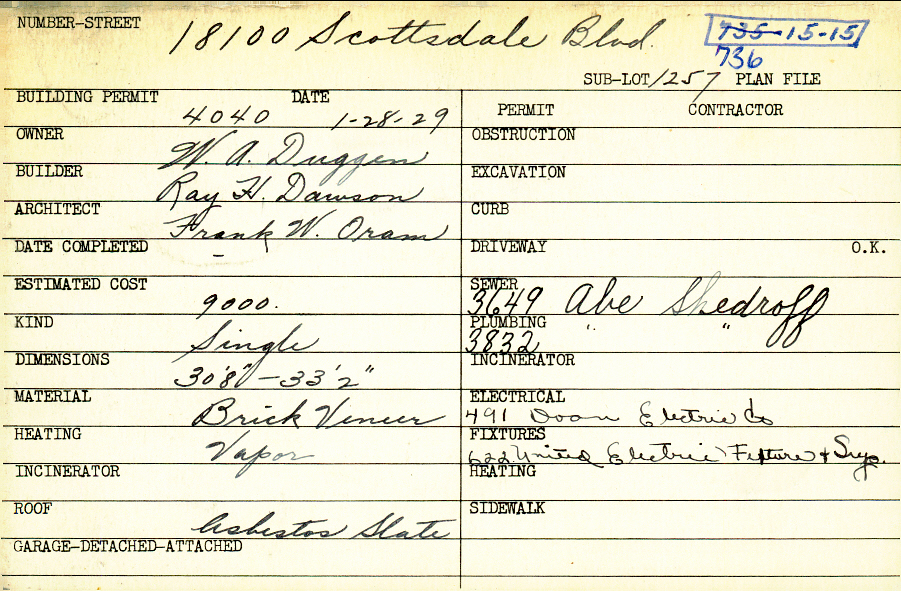 18100 Scottsdale Boulevard Shaker Heights, OH 44120 PARCEL ID: 736-15-015 Building Permit Date: 01-28-1929 Plan File Number: 0 Neighborhood: Lomond Owner: Duggen, W. A. Builder: Dawson, Ray H. Architect: Oram, Frank W. Estimated Cost: 9000 Kind: Single, Single Residence or Dwelling Material: Brick Veneer Heating: Vapor Roof: Slate |