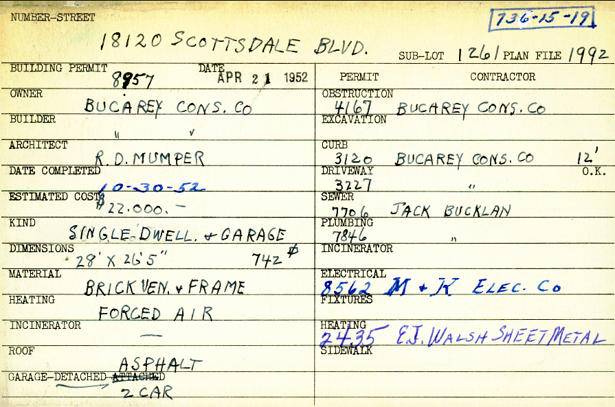 18120 Scottsdale Boulevard Shaker Heights, OH 44120 PARCEL ID: 736-15-019 Building Permit Date: 04-21-1952 Plan File Number: 1992, 5665 Microfilm Roll: Roll#30, Roll#76 Neighborhood: Lomond Owner: BuCarey Construction Company Builder: BuCarey Construction Company Architect: Mumper, R. D. Estimated Cost: 22000 Date Completed: 10-30-1952 Kind: Single Dwelling and Garage Material: Brick Veneer and Frame Heating: Forced Air Roof: Asphalt Garage: detached 2 car |