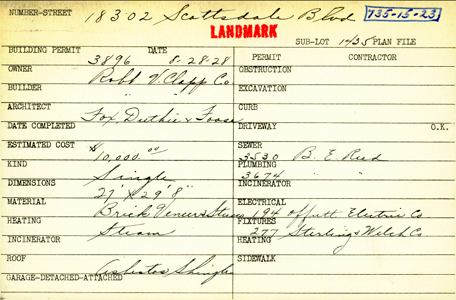 18302 Scottsdale Boulevard Shaker Heights, OH 44120 PARCEL ID: 736-15-023 Building Permit Date: 08-28-1928 Plan File Number: 12957 all scanned Microfilm Roll: NewRoll19 Neighborhood: Lomond Owner: Robb V. Clapp Co. Builder: Robb V. Clapp Co. Architect: Fox Duthie and Foose Estimated Cost: 10000 Kind: Single, Single Residence or Dwelling Material: Brick Veneer and Stucco Heating: Steam Roof: Asbestos Shingles Card Available: Yes Blueprints: online, see link above |
