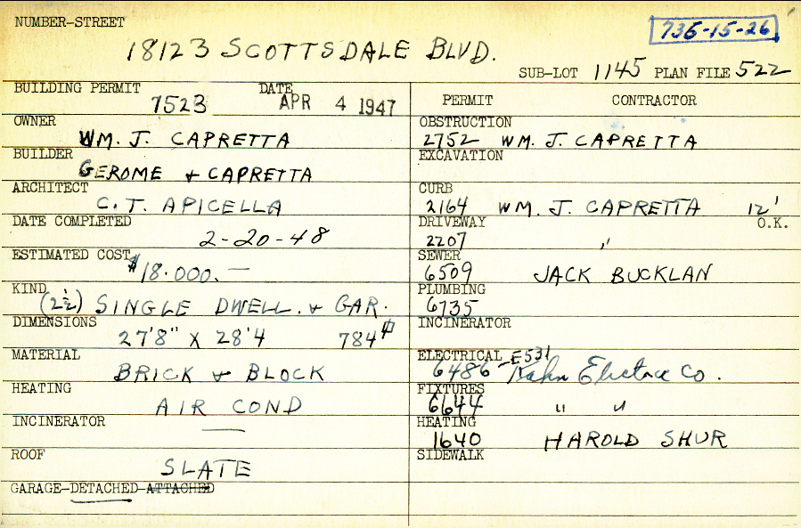 18123 Scottsdale Boulevard Shaker Heights, OH 44120 PARCEL ID: 736-15-026 Building Permit Date: 04-04-1947 Plan File Number: 522 all scanned Microfilm Roll: Roll007 Neighborhood: Lomond Owner: Capretta, William J. Builder: Gerome and Capretta Architect: Apicella, C. T. Estimated Cost: 18000 Date Completed: 02-20-1948 Kind: Single 2-1/2 Material: Brick and Block Heating: Air Conditioned Roof: Slate Garage: detached |