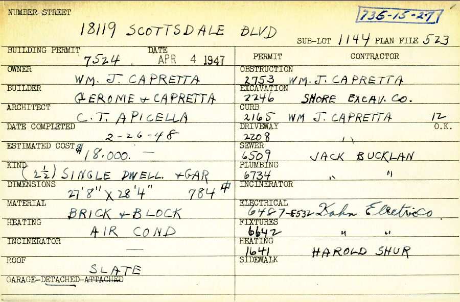 18119 Scottsdale Boulevard Shaker Heights, OH 44122 PARCEL ID: 736-15-027 Building Permit Date: 04-04-1947 Plan File Number: 523 scanned, 5715 Microfilm Roll: Roll007, Roll#77 Neighborhood: Lomond Owner: Capretta, William J. Builder: Gerome and Capretta Architect: Apicella, C. T. Estimated Cost: 18000 Date Completed: 02-26-1948 Kind: Single 2-1/2 Material: Brick and Block Heating: Air Conditioned Roof: Slate Garage: detached |
