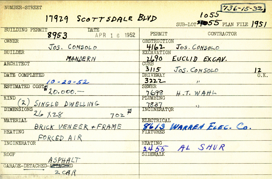 17929 Scottsdale Boulevard Shaker Heights, OH 44122 PARCEL ID: 736-15-032 Building Permit Date: 04-16-1952 Plan File Number: 1951 all scanned Microfilm Roll: Roll029 Neighborhood: Lomond Owner: Consolo, Joseph Builder: Mandern Estimated Cost: 20000 Date Completed: 10-20-1952 Kind: Single, Single Residence or Dwelling (2) Material: Brick Veneer and Frame Heating: Forced Air Roof: Asphalt Garage: detached 2 car |