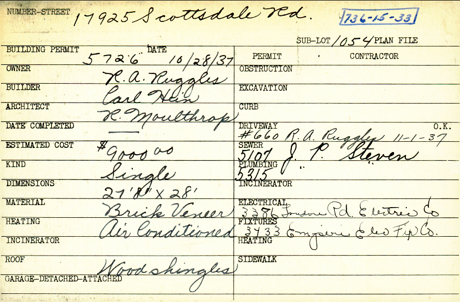 17925 Scottsdale Boulevard Shaker Heights, OH 44122 PARCEL ID: 736-15-033 Building Permit Date: 10-28-1937 Plan File Number: 0 Neighborhood: Lomond Owner: Ruggles, R. A. Builder: Hein, Carl Architect: Moulthrop, R. Estimated Cost: 9000 Kind: Single, Single Residence or Dwelling Material: Brick Veneer Heating: Air Conditioned Roof: Wood Shingle |