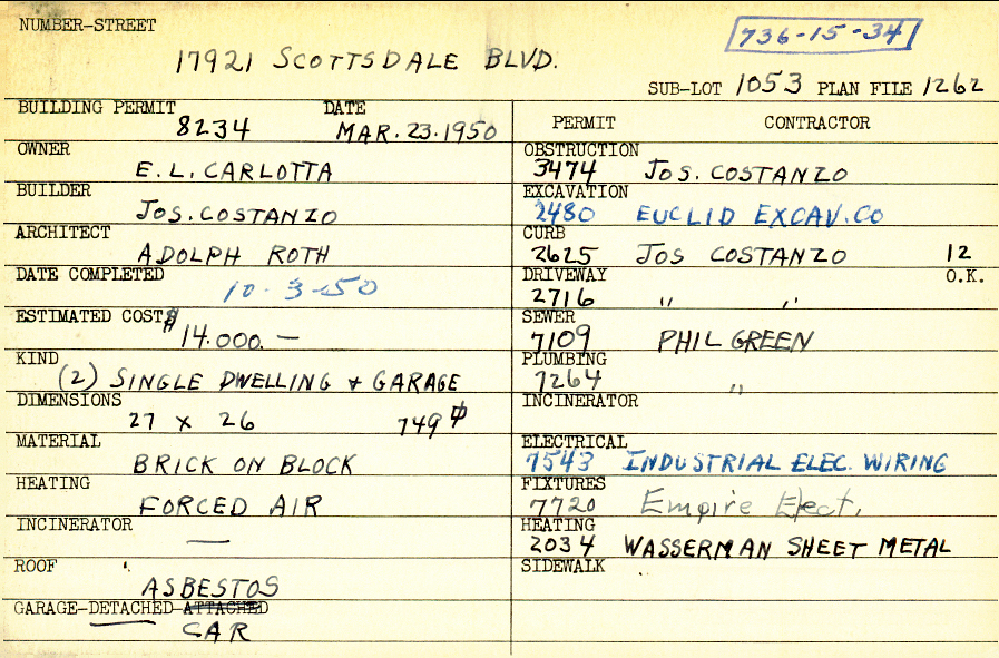 17921 Scottsdale Boulevard Shaker Heights, OH 44122 PARCEL ID: 736-15-034 Building Permit Date: 03-23-1950 Plan File Number: 1262 all scanned Microfilm Roll: Roll015 Neighborhood: Lomond Owner: Carlotta, E. L. Builder: Costanzo, Joseph Architect: Roth, Adolph Estimated Cost: 14000 Date Completed: 10-03-1950 Kind: Single Dwelling and Garage (2) Material: Brick on Block Heating: Forced Air Roof: Asbestos Garage: detached 2 car |