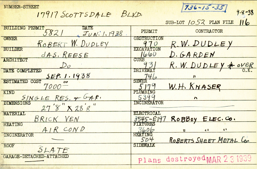 17917 Scottsdale Boulevard Shaker Heights, OH 44122 PARCEL ID: 736-15-035 Building Permit Date: 06-01-1938 Plan File Number: 116, 12366 Microfilm Roll: NewRoll#12 Neighborhood: Lomond Owner: Dudley, Robert W. Builder: Reese, James A. Architect: Reese, James A. Estimated Cost: 7000 Date Completed: 09-01-1938 Kind: Single Dwelling and Garage Material: Brick Veneer Heating: Air Conditioned Roof: Slate Garage: detached |