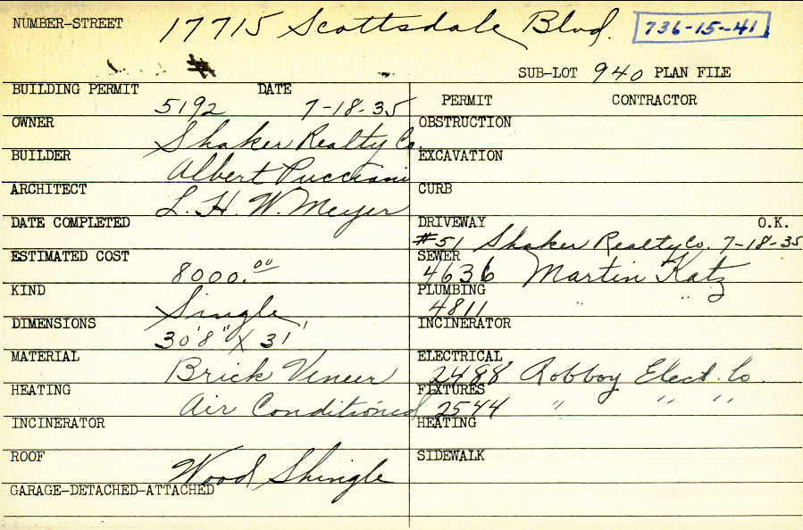 17715 Scottsdale Boulevard Shaker Heights, OH 44122 PARCEL ID: 736-15-041 Building Permit Date: 07-18-1935 Plan File Number: 0 Neighborhood: Lomond Owner: Shaker Realty Company Builder: Pucciani, Albert Architect: Meyer, L. H. W. Estimated Cost: 8000 Kind: Single, Single Residence or Dwelling Material: Brick Veneer Heating: Air Conditioned Roof: Wood Shingle Card Available: yes |