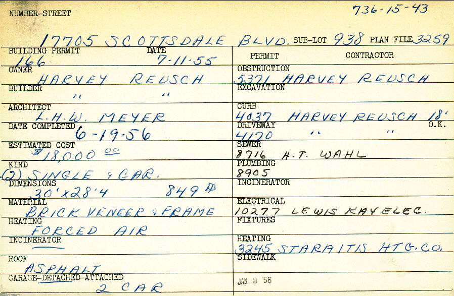 17705 Scottsdale Boulevard Shaker Heights, OH 44122 PARCEL ID: 736-15-043 Building Permit Date: 07-11-1955 Plan File Number: 3259 Microfilm Roll: Roll#47 Neighborhood: Lomond Owner: Reusch, Harvey Builder: Reusch, Harvey Architect: Meyer, L. H. W. Estimated Cost: 18000 Date Completed: 06-19-1956 Kind: Single Dwelling and Garage (2) Material: Brick Veneer and Frame Heating: Forced Air Roof: Asphalt Garage: detached 2 car |