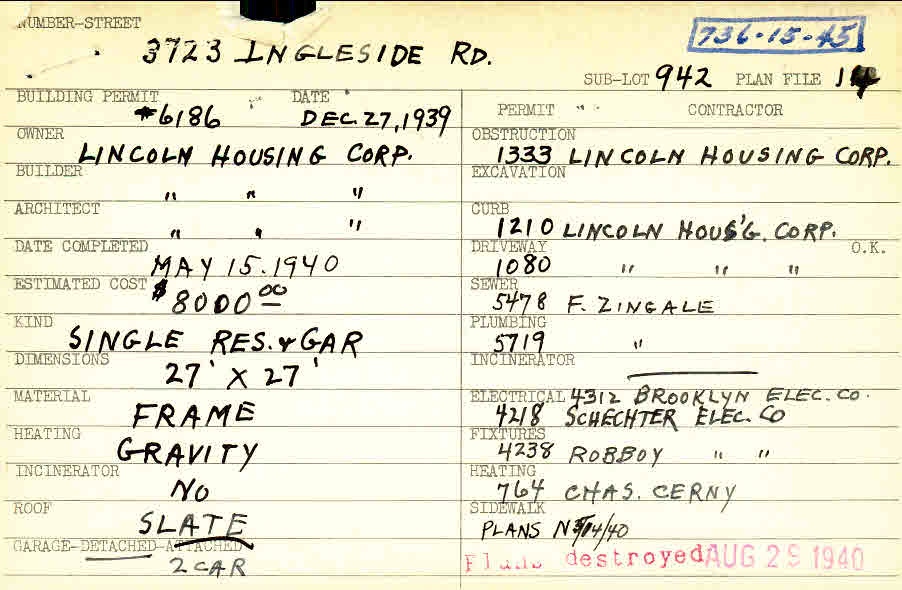 3723 Ingleside Road Shaker Heights, OH 44122 PARCEL ID: 736-15-045 Building Permit Date: 12-27-1939 Plan File Number: 14 Neighborhood: Lomond Owner: Lincoln Housing Corporation Builder: Lincoln Housing Corporation Architect: Lincoln Housing Corporation Estimated Cost: 8000 Date Completed: 05-15-1940 Kind: Single Dwelling and Garage Material: Frame Heating: Gravity System Roof: Slate Garage: detached 2 car Card Available: yes |