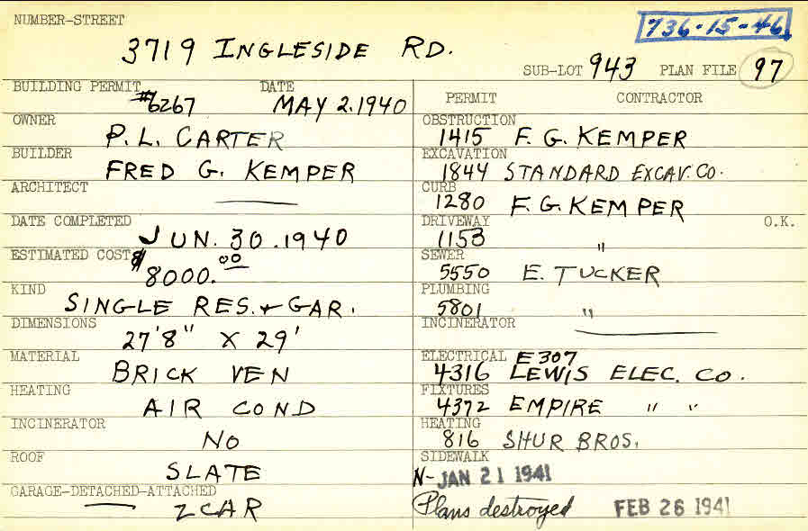 3719 Ingleside Road Shaker Heights, OH 44122 PARCEL ID: 736-15-046 Building Permit Date: 05-02-1940 Plan File Number: 97 Neighborhood: Lomond Owner: Carter, P. L. Builder: Kemper, Fred G. Estimated Cost: 8000 Date Completed: 06-30-1940 Kind: Single Dwelling and Garage Material: Brick Veneer Heating: Air Conditioned Roof: Slate Garage: detached 2 car Card Available: yes |
