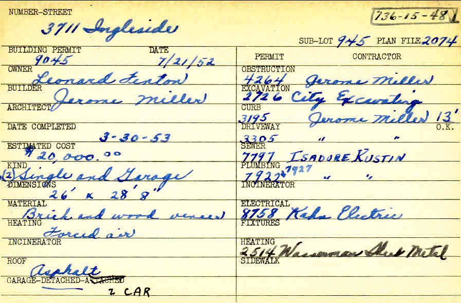 3711 Ingleside Road Shaker Heights, OH 44122 PARCEL ID: 736-15-048 Building Permit Date: 07-21-1952 Plan File Number: 2074 Microfilm Roll: Roll#32 Neighborhood: Lomond Owner: Fenton, Leonard Builder: Miller, Jerome Estimated Cost: 20000 Date Completed: 03-30-1953 Kind: Single Dwelling and Garage (2) Material: Brick and Wood Veneer Heating: Forced Air Roof: Asphalt Garage: detached 2 car |