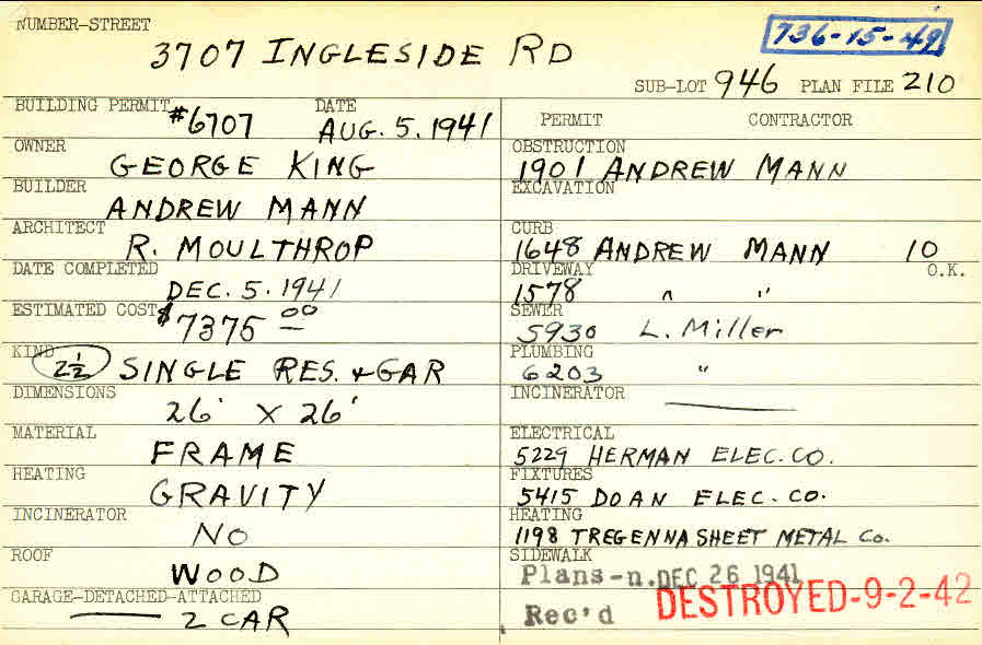 3707 Ingleside Road Shaker Heights, OH 44122 PARCEL ID: 736-15-049 Building Permit Date: 08-05-1941 Plan File Number: 210 Neighborhood: Lomond Owner: King, George Builder: Mann, Andrew Architect: Moulthrop, R. Estimated Cost: 7375 Date Completed: 12-05-1941 Kind: Single 2-1/2 Material: Frame Heating: Gravity System Roof: Wood Garage: detached 2 car Card Available: yes |