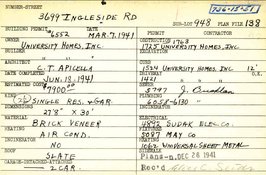 3699 Ingleside Road Shaker Heights, OH 44122 PARCEL ID: 736-15-051 Building Permit Date: 03-07-1941 Plan File Number: 138 Neighborhood: Lomond Owner: University Homes Inc. Builder: University Homes Inc. Architect: Apicella, C. T. Estimated Cost: 7900 Date Completed: 06-18-1941 Kind: Single 2-1/2 Material: Brick Veneer Heating: Air Conditioned Roof: Slate Garage: detached 2 car Card Available: yes |