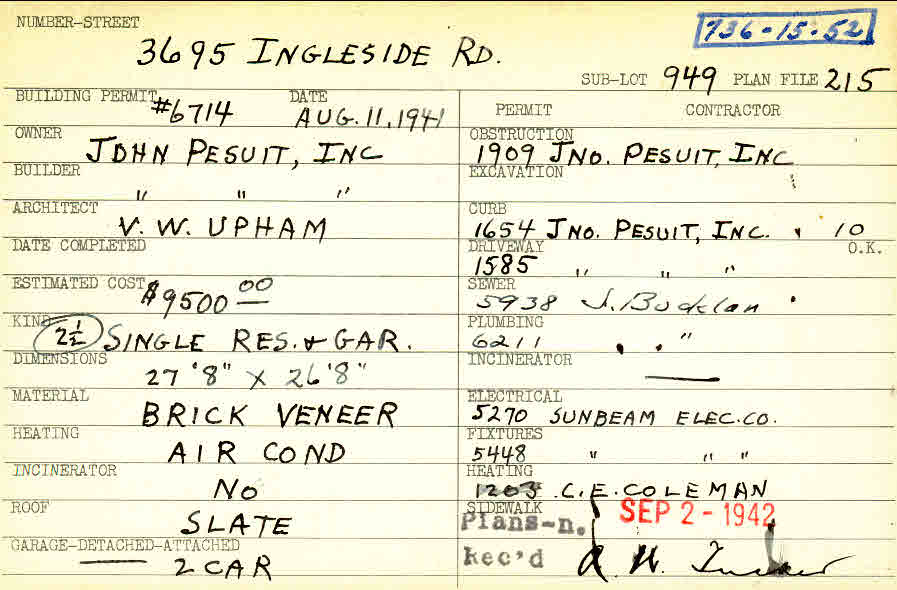 3695 Ingleside Road Shaker Heights, OH 44122 PARCEL ID: 736-15-052 Building Permit Date: 08-11-1941 Plan File Number: 215 Neighborhood: Lomond Owner: John Pesuit Inc Builder: John Pesuit Inc Architect: Upham, V. W. Estimated Cost: 9500 Kind: Single 2-1/2 Material: Brick Veneer Heating: Air Conditioned Roof: Slate Garage: detached 2 car Card Available: yes |