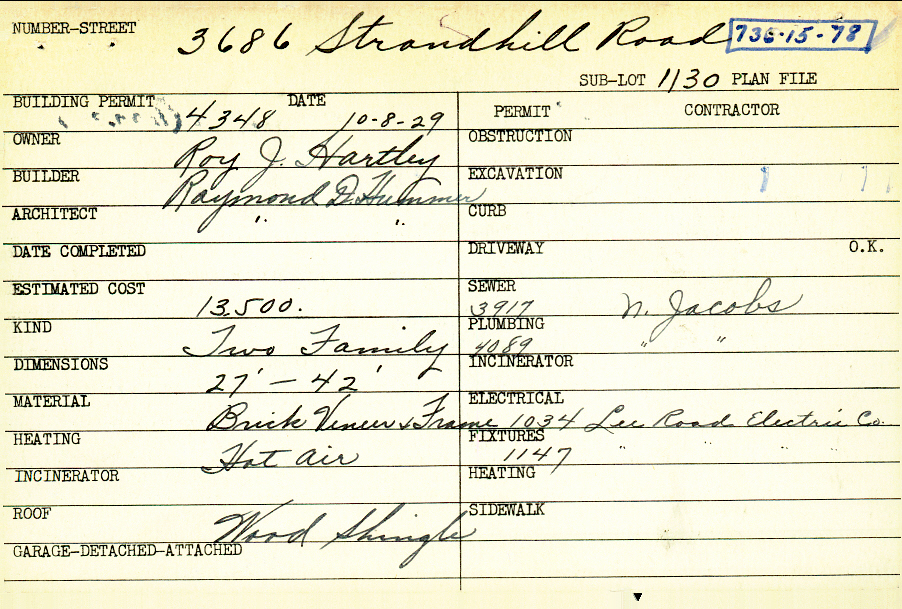 3686 Strandhill Road Shaker Heights, OH 44122 PARCEL ID: 736-15-078 Building Permit Date: 10-08-1929 Plan File Number: 4358 all scanned Microfilm Roll: Roll062 Neighborhood: Lomond Owner: Hartley, Roy J. Builder: Hummer, Raymond D. Architect: Hummer, Raymond D. Estimated Cost: 13500 Kind: Duplex or Two-Family Material: Brick Veneer and Frame Heating: Hot Air Roof: Wood Shingle |