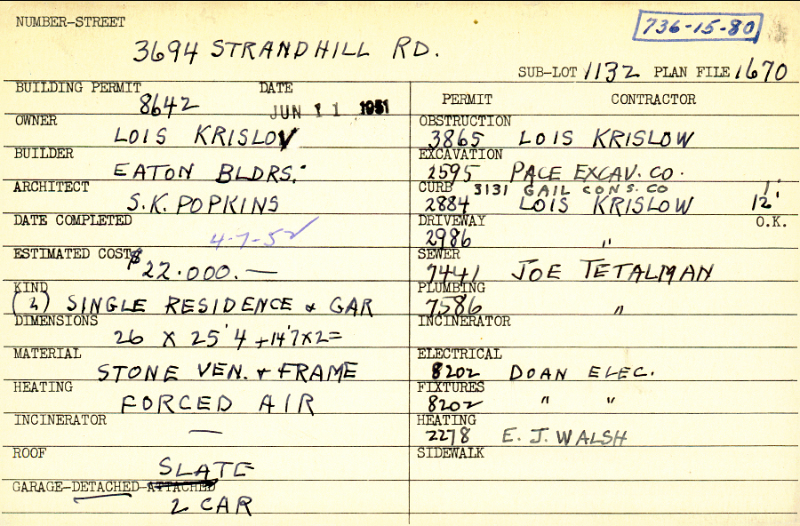 3694 Strandhill Road Shaker Heights, OH 44122 PARCEL ID: 736-15-080 Building Permit Date: 06-11-1951 Plan File Number: 1670 all scanned Microfilm Roll: Roll025 Neighborhood: Lomond Owner: Krislov, Lois Builder: Eaton Builders Architect: Popkins, S. K. Estimated Cost: 22000 Date Completed: 04-07-1952 Kind: Single Dwelling and Garage (2) Material: Stone Veneer and Frame Heating: Forced Air Roof: Slate Garage: detached 2 car |