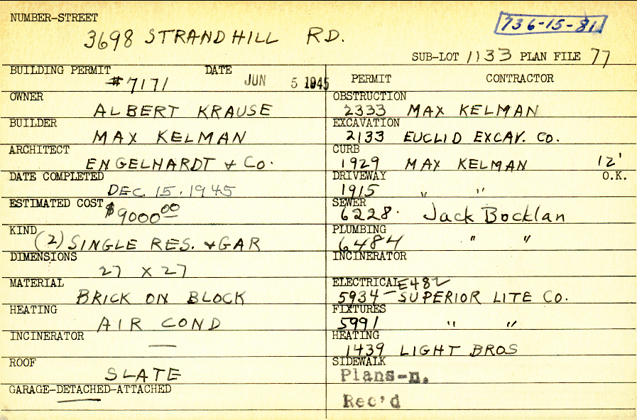 3698 Strandhill Road Shaker Heights, OH 44122 PARCEL ID: 736-15-081 Building Permit Date: 06-05-1945 Plan File Number: 77 all scanned Microfilm Roll: Roll001 Neighborhood: Lomond Owner: Krause, Albert Builder: Kelman, Max Architect: Engelhardt and Company Estimated Cost: 9000 Date Completed: 12-15-1945 Kind: Single Dwelling and Garage (2) Material: Brick on Block Heating: Air Conditioned Roof: Slate Garage: detached |