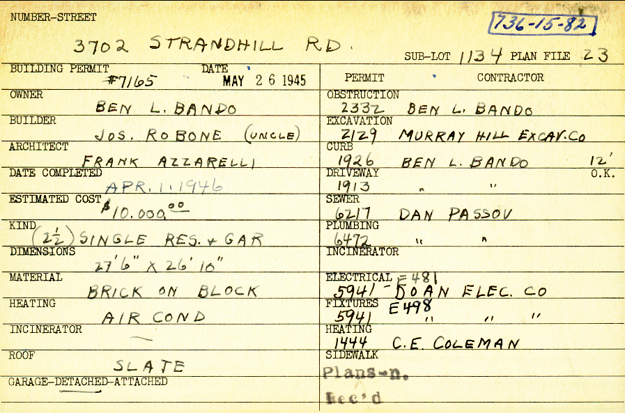 3702 Strandhill Road Shaker Heights, OH 44122 PARCEL ID: 736-15-082 Building Permit Date: 05-26-1945 Plan File Number: 23 all scanned Microfilm Roll: Roll001 Neighborhood: Lomond Owner: Bando, Ben L. Builder: Robone, Joseph (Uncle) Architect: Azzarelli, Frank Estimated Cost: 10000 Date Completed: 04-11-1946 Kind: Single 2-1/2 Material: Brick on Block Heating: Air Conditioned Roof: Slate Garage: detached |
