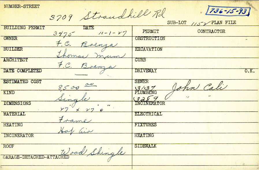 3709 Strandhill Road Shaker Heights, OH 44122 PARCEL ID: 736-15-093 Building Permit Date: 11-01-1927 Plan File Number: 0 Neighborhood: Lomond Owner: Brenza, F. C. Builder: Mum, Thomas Architect: Brenza, F. C. Estimated Cost: 8500 Kind: Single, Single Residence or Dwelling Material: Frame Heating: Hot Air Roof: Wood Shingle Card Available: yes |