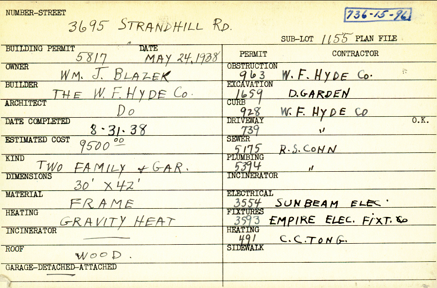 3695 Strandhill Road Shaker Heights, OH 44122 PARCEL ID: 736-15-096 Building Permit Date: 05-24-1938 Plan File Number: 576 all scanned Microfilm Roll: Roll007 Neighborhood: Lomond Owner: Blazek, William J. Builder: The W. F. Hyde Company Architect: The W. F. Hyde Company Estimated Cost: 9500 Date Completed: 08-31-1938 Kind: Duplex or Two-Family and Garage Material: Frame Heating: Gravity System Roof: Wood Garage: detached |
