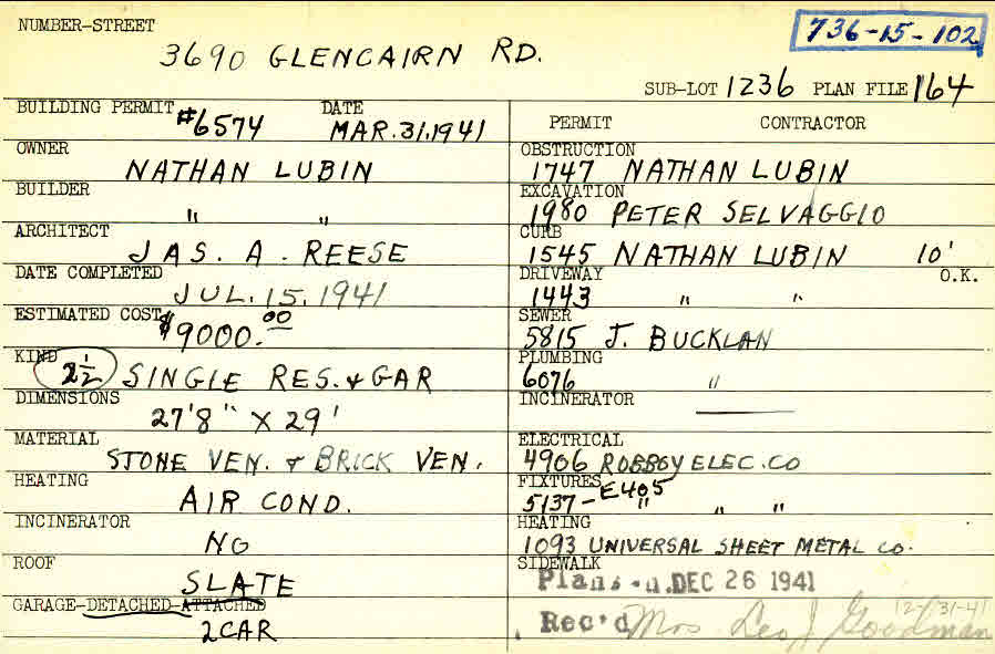 3690 Glencairn Road Shaker Heights, OH 44122 PARCEL ID: 736-15-102 Building Permit Date: 03-31-1941 Plan File Number: 164 Neighborhood: Fernway Owner: Lubin, Nathan Builder: Lubin, Nathan Architect: Reese, James A. Estimated Cost: 9000 Date Completed: 07-15-1941 Kind: Single Dwelling and Garage (2) Material: Stone Veneer and Brick Veneer Heating: Air Conditioned Roof: Slate Garage: detached 2 car Card Available: yes |