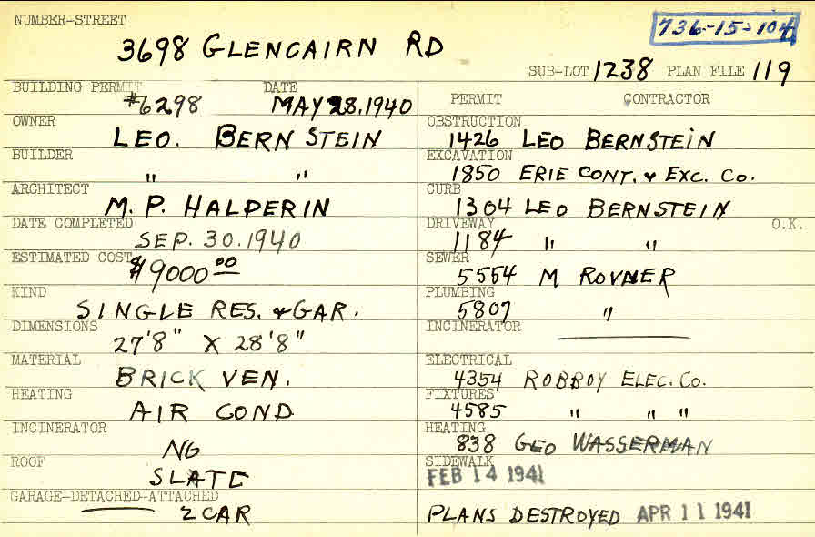 3698 Glencairn Road Shaker Heights, OH 44122 PARCEL ID: 736-15-104 Building Permit Date: 05-28-1940 Plan File Number: 119 Neighborhood: Fernway Owner: Bernstein, Leo Builder: Bernstein, Leo Architect: Halperin, M. P. Estimated Cost: 9000 Date Completed: 09-30-1940 Kind: Single Dwelling and Garage Material: Brick Veneer Heating: Air Conditioned Roof: Slate Garage: detached 2 car Card Available: yes |