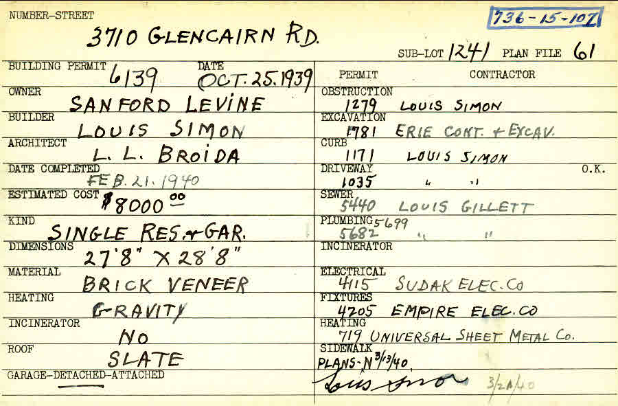 3710 Glencairn Road Shaker Heights, OH 44122 PARCEL ID: 736-15-107 Building Permit Date: 10-25-1939 Plan File Number: 61 Neighborhood: Fernway Owner: Levine, Sanford Builder: Simon, Louis Architect: Broida, L. L. Estimated Cost: 8000 Date Completed: 02-21-1940 Kind: Single Dwelling and Garage Material: Brick Veneer Heating: Gravity System Roof: Slate Garage: detached |