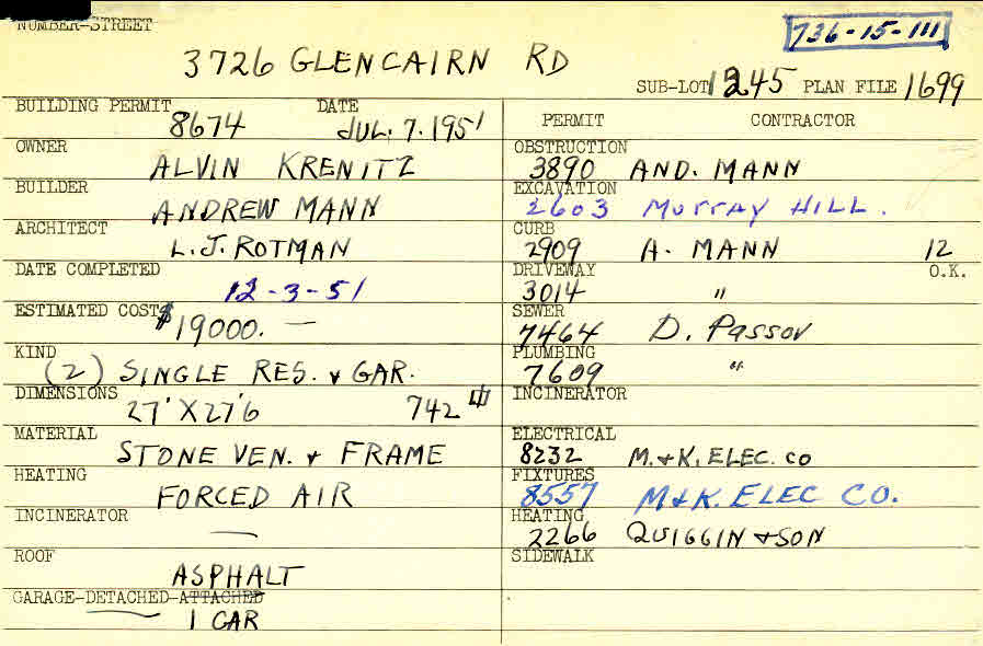 3726 Glencairn Road Shaker Heights, OH 44122 PARCEL ID: 736-15-111 Building Permit Date: 07-07-1951 Plan File Number: 1699 all scanned Microfilm Roll: Roll026 Owner: Krenitz, Alvin Builder: Mann, Andrew Architect: Rotman, L. J. Estimated Cost: 19000 Date Completed: 12-03-1951 Kind: Single Dwelling and Garage (2) Material: Stone Veneer and Frame Heating: Forced Air Roof: Asphalt Garage: detached |