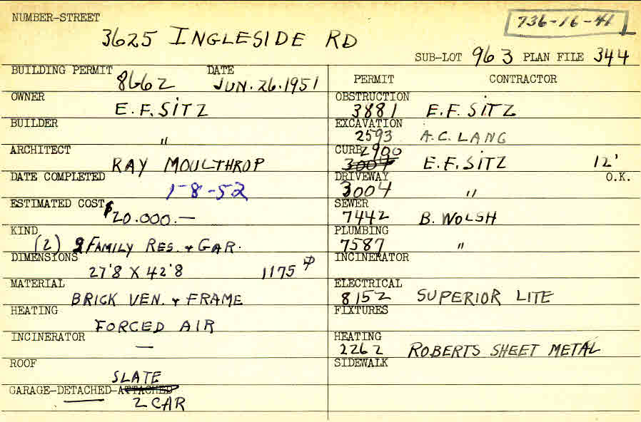 3625 Ingleside Road Shaker Heights, OH 44122 PARCEL ID: 736-16-041 Building Permit Date: 06-26-1951 Plan File Number: 344 Neighborhood: Lomond Owner: Sitz, E. F. Builder: Sitz, E. F. Architect: Moulthrop, Ray Estimated Cost: 20000 Date Completed: 01-08-1952 Kind: Duplex or Two-Family and Garage Material: Brick Veneer and Frame Heating: Forced Air Roof: Slate Garage: detached 2 car |