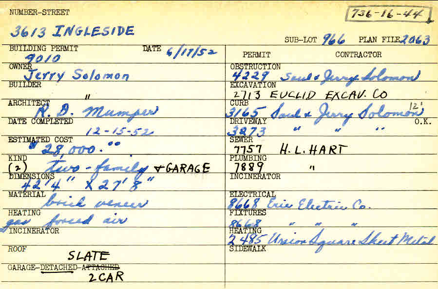 3613 Ingleside Road Shaker Heights, OH 44122 PARCEL ID: 736-16-044 Building Permit Date: 06-17-1952 Plan File Number: 2063, 4716, 6385 Microfilm Roll: Roll#31, Roll#65, Roll#85 Neighborhood: Lomond Owner: Solomon, Jerry Builder: Solomon, Jerry Architect: Mumper, R. D. Estimated Cost: 28000 Date Completed: 12-15-1952 Kind: Duplex or Two-Family and Garage Material: Brick Veneer Heating: Forced Air - Gas Roof: Slate Garage: detached 2 car |