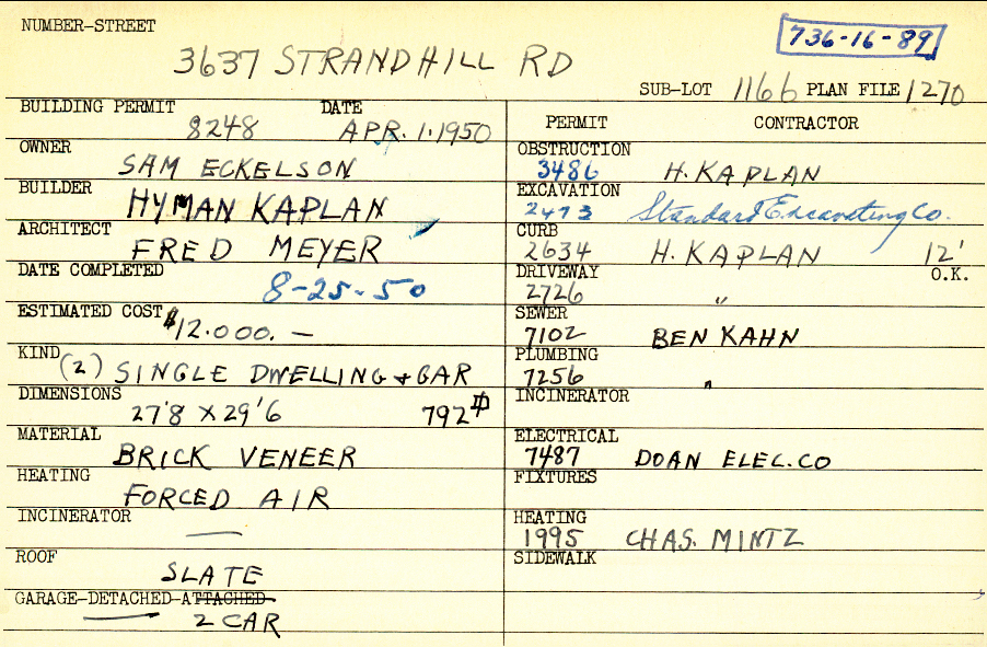 3637 Strandhill Road Shaker Heights, OH 44122 PARCEL ID: 736-16-089 Building Permit Date: 04-01-1950 Plan File Number: 1270 all scanned Microfilm Roll: Roll015 Neighborhood: Lomond Owner: Eckelson, Sam Builder: Kaplan, Hyman Architect: Meyer, Fred Estimated Cost: 12000 Date Completed: 08-25-1950 Kind: Single Dwelling and Garage (2) Material: Brick Veneer Heating: Forced Air Roof: Slate Garage: detached 2 car |
