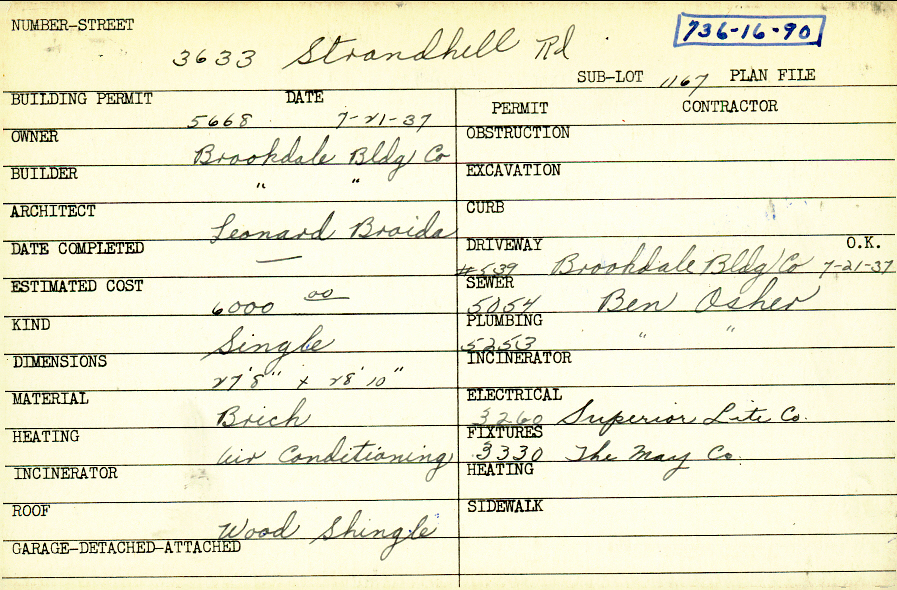 3633 Strandhill Road Shaker Heights, OH 44122 PARCEL ID: 736-16-090 Building Permit Date: 07-21-1937 Plan File Number: 0 Neighborhood: Lomond Owner: Brookdale Building Company Builder: Brookdale Building Company Architect: Broida, Leonard Estimated Cost: 6000 Kind: Single, Single Residence or Dwelling Material: Brick Heating: Air Conditioned Roof: Wood Shingle |