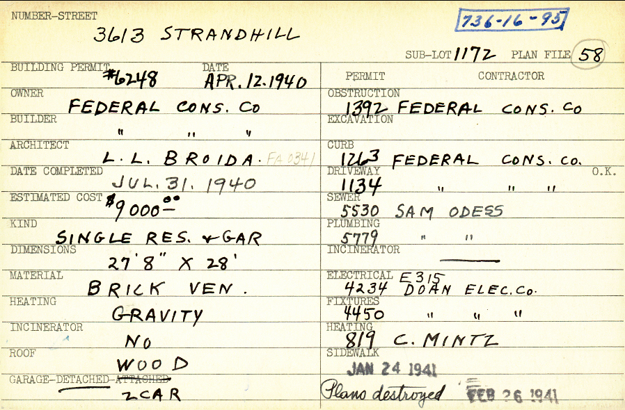 3613 Strandhill Road Shaker Heights, OH 44122 PARCEL ID: 736-16-095 Building Permit Date: 04-12-1940 Plan File Number: 58 Neighborhood: Lomond Owner: Federal Construction Company Builder: Federal Construction Company Architect: Broida, L. L. Estimated Cost: 9000 Date Completed: 07-31-1940 Kind: Single Dwelling and Garage Material: Brick Veneer Heating: Gravity System Roof: Wood Garage: detached 2 car |