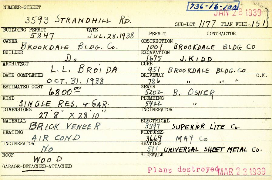 3593 Strandhill Road Shaker Heights, OH 44122 PARCEL ID: 736-16-100 Building Permit Date: 07-28-1938 Neighborhood: Lomond Owner: Brookdale Building Company Builder: Brookdale Building Company Architect: Broida, L. L. Estimated Cost: 6800 Date Completed: 10-31-1938 Kind: Single Dwelling and Garage Material: Brick Veneer Heating: Air Conditioned Roof: Wood Garage: detached Blueprints: no blueprints on microfilm |