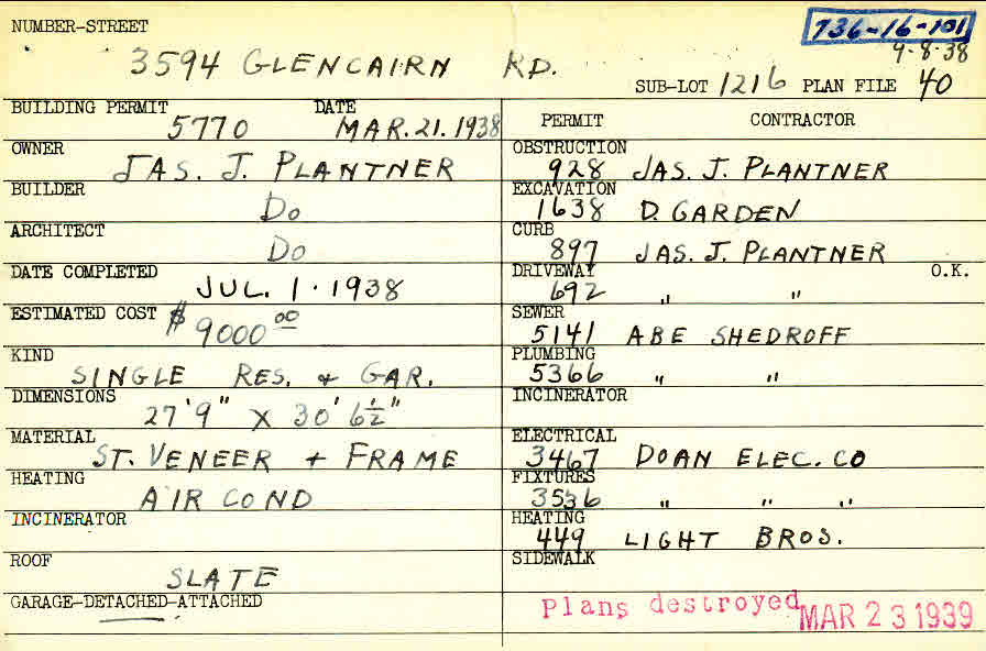 3594 Glencairn Road Shaker Heights, OH 44122 PARCEL ID: 736-16-101 Building Permit Date: 03-21-1938 Plan File Number: 40, 3213, 7799 Microfilm Roll: Roll#47, Roll#94 Neighborhood: Fernway Owner: Plantner, James J. Builder: Plantner, James J. Architect: Plantner, James J. Estimated Cost: 9000 Date Completed: 07-01-1938 Kind: Single Dwelling and Garage Material: Stone Veneer and Frame Heating: Air Conditioned Roof: Slate Garage: detached |