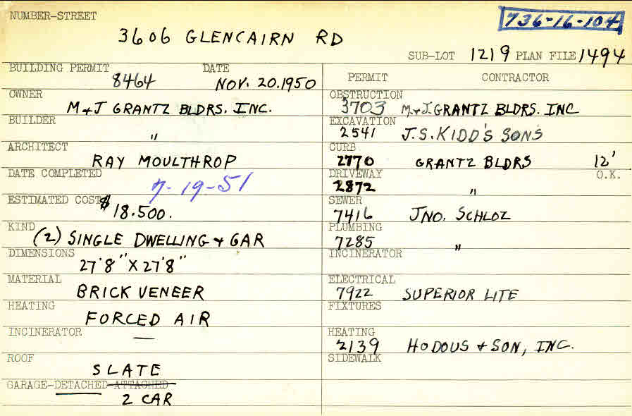 3606 Glencairn Road Shaker Heights, OH 44122 PARCEL ID: 736-16-104 Building Permit Date: 11-20-1950 Plan File Number: 1494 all scanned Microfilm Roll: Roll017 Owner: M. and J. Grantz Builders, Inc. Builder: M. and J. Grantz Builders, Inc. Architect: Moulthrop, Ray Estimated Cost: 18500 Date Completed: 07-19-1951 Kind: Single Dwelling and Garage (2) Material: Brick Veneer Heating: Forced Air Roof: Slate Garage: detached 2 car |