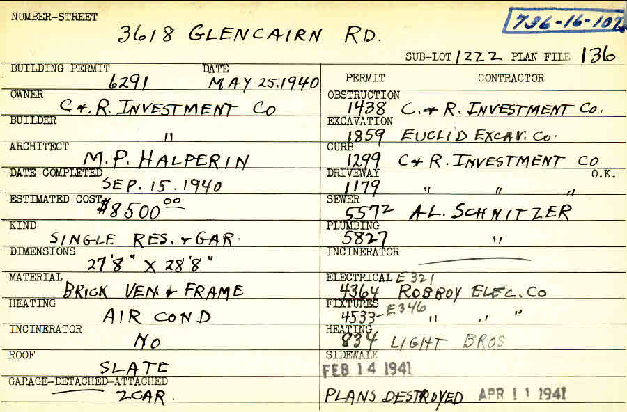 3618 Glencairn Road Shaker Heights, OH 44122 PARCEL ID: 736-16-107 Building Permit Date: 05-25-1940 Plan File Number: 136, 10338 Microfilm Roll: NewRoll#3 Neighborhood: Fernway Owner: C. and R. Investment Company Builder: C. and R. Investment Company Architect: Halperin, M. P. Estimated Cost: 8500 Date Completed: 09-15-1940 Kind: Single Dwelling and Garage Material: Brick Veneer and Frame Heating: Air Conditioned Roof: Slate Garage: detached 2 car |