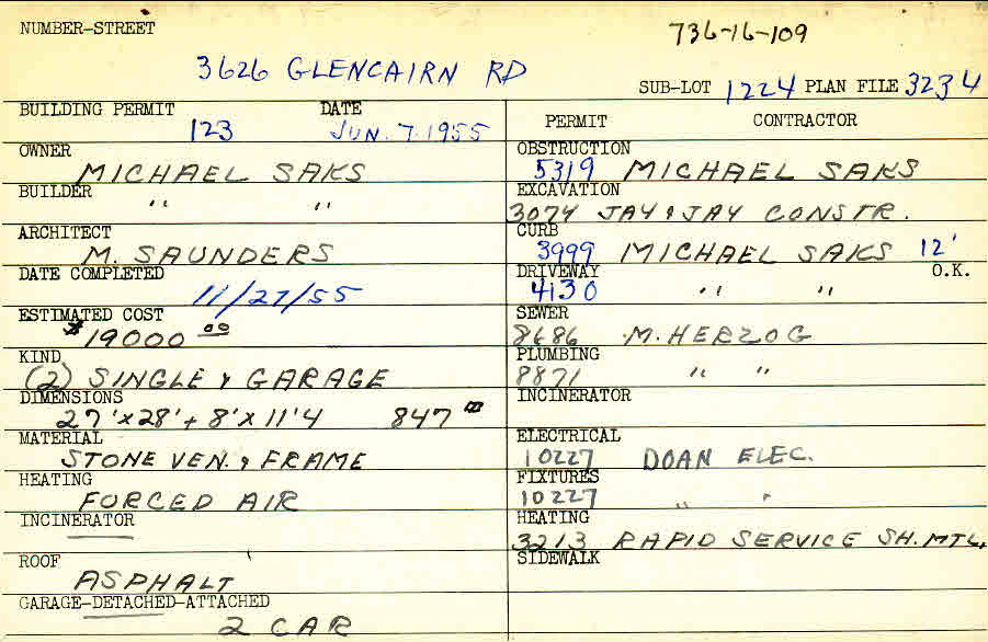 3626 Glencairn Road Shaker Heights, OH 44122 PARCEL ID: 736-16-109 Building Permit Date: 06-07-1955 Plan File Number: 3234 Microfilm Roll: Roll#47 Neighborhood: Fernway Owner: Saks, Michael Builder: Saks, Michael Architect: Saunders, M. Estimated Cost: 19000 Date Completed: 11-27-1955 Kind: Single Dwelling and Garage (2) Material: Stone Veneer and Frames Heating: Forced Air Roof: Asphalt Garage: detached 2 car |