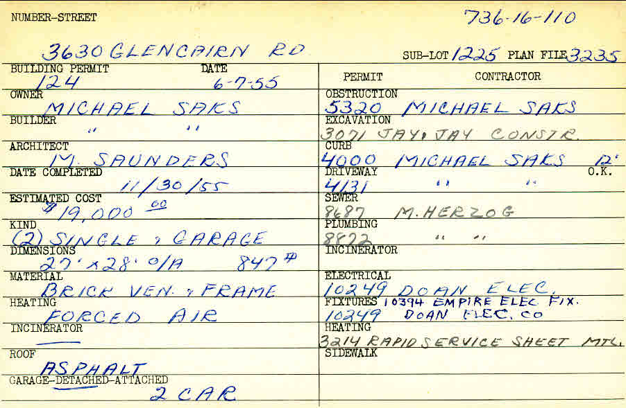 3630 Glencairn Road Shaker Heights, OH 44122 PARCEL ID: 736-16-110 Building Permit Date: 06-07-1955 Plan File Number: 3235 Microfilm Roll: Roll#47 Neighborhood: Fernway Owner: Saks, Michael Builder: Saks, Michael Architect: Saunders, M. Estimated Cost: 19000 Date Completed: 11-30-1955 Kind: Single Dwelling and Garage (2) Material: Brick Veneer and Frame Heating: Forced Air Roof: Asphalt Garage: detached 2 car |