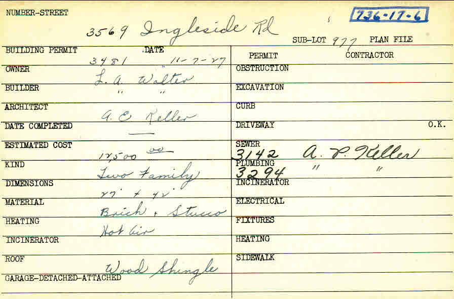 3569 Ingleside Road Shaker Heights, OH 44122 PARCEL ID: 736-17-006 Building Permit Date: 11-07-1927 Plan File Number: 0 Neighborhood: Lomond Owner: Walter, L. A. Builder: Walter, L. A. Architect: Keller, Arthur Emil Estimated Cost: 12500 Kind: Duplex or Two-Family Material: Brick and Stucco Heating: Hot Air Roof: Wood Shingle |