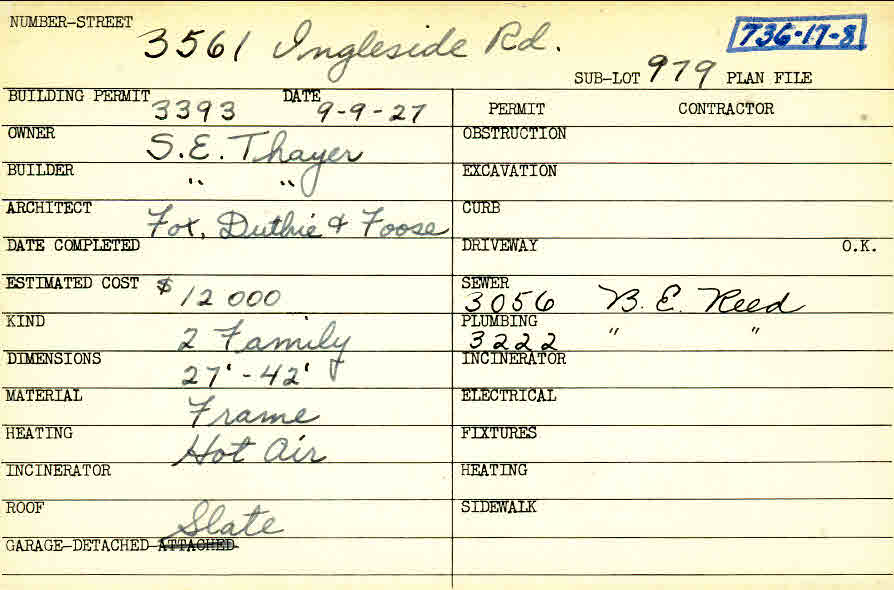 3561 Ingleside Road Shaker Heights, OH 44122 PARCEL ID: 736-17-008 Building Permit Date: 09-09-1927 Plan File Number: 0 Neighborhood: Lomond Owner: Thayer, S. E. Builder: Thayer, S. E. Architect: Fox, Duthie and Foose Estimated Cost: 12000 Kind: Duplex or Two-Family Material: Frame Heating: Hot Air Roof: Slate Garage: detached Card Available: yes |