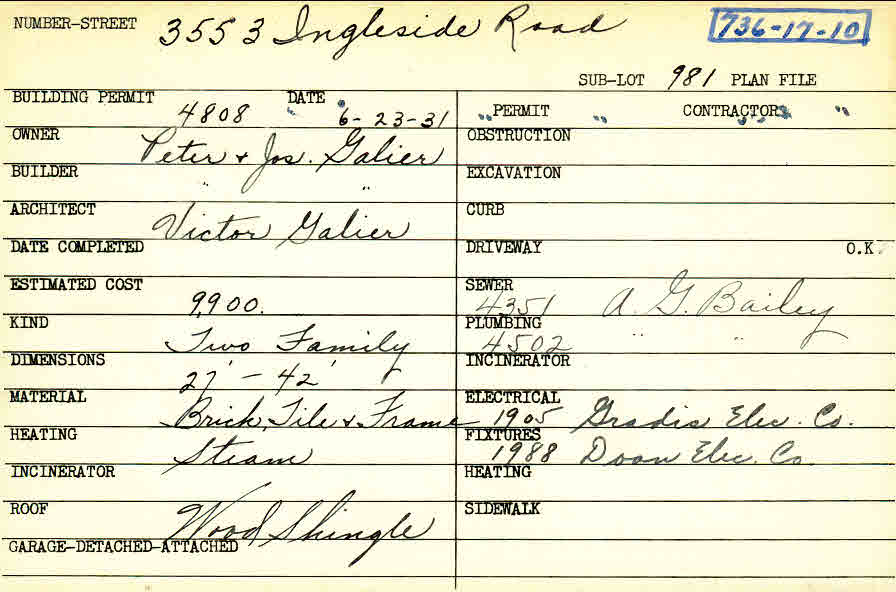 3553 Ingleside Road Shaker Heights, OH 44122 PARCEL ID: 736-17-010 Building Permit Date: 06-23-1931 Plan File Number: 0 Neighborhood: Lomond Owner: Galier, Peter and Joseph Builder: Galier, Peter and Joseph Architect: Galier, Victor Estimated Cost: 9900 Kind: Duplex or Two-Family Material: Brick, Tile and Frame Heating: Steam Roof: Wood Shingle Card Available: yes |